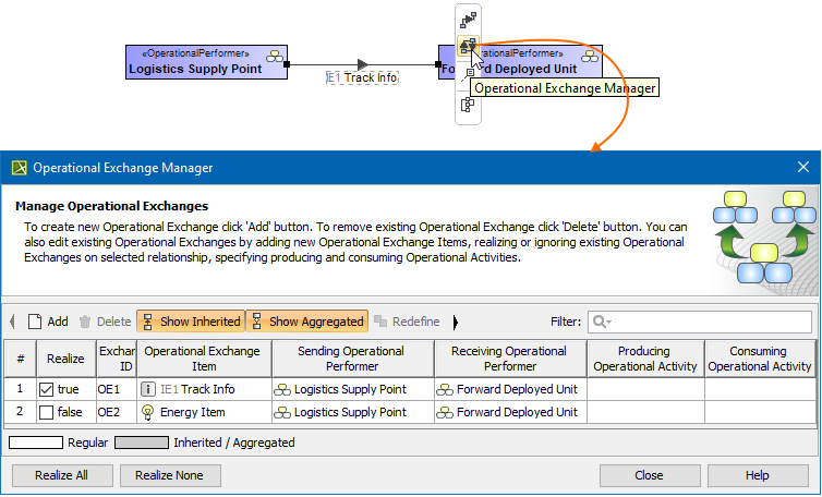 Click to select or clear the check box in the Realize column to show (realize) or hide Operational Exchanges on the Association.