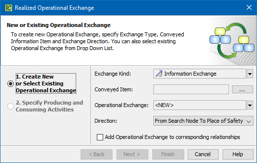 - In the smart manipulator toolbar, click New Operational Exchange. The Realized Operational Exchange wizard opens.