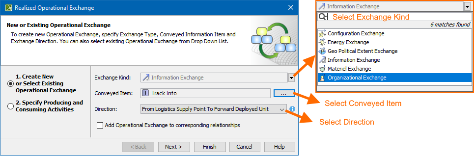 You can create the Operational Exchanges on the Association by dragging the Exchange Elements onto the Association. When you drop the Exchange Element on the Association, the Realized Operational Exchange wizard opens.