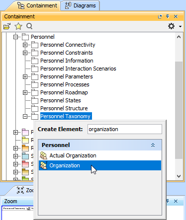 - In the Containment tree, right click the Personnel Taxonomy package and from the shortcut menu, select Create Element. Search for the Organization (or other appropriate element) and select it.