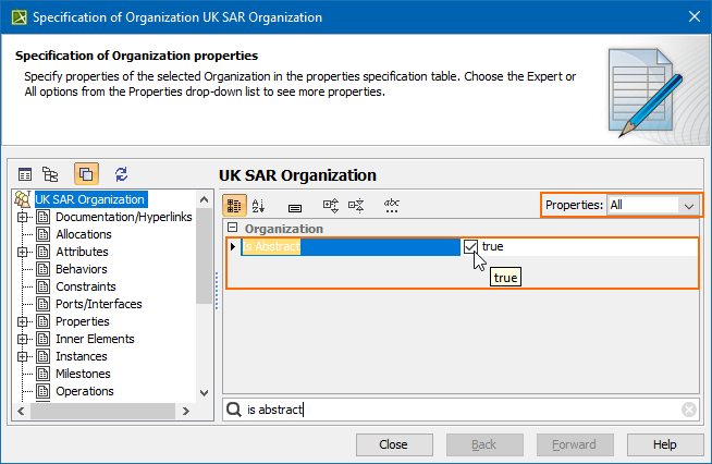 - Select an element and open its Specification window.