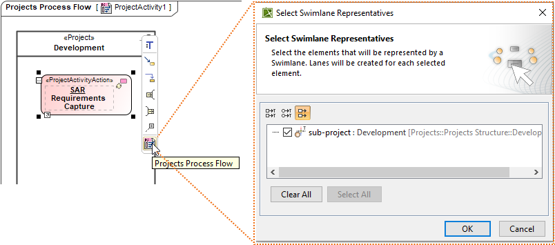 The Projects Process Flow diagram is created. In the Swimlane, you can add either Projects Activity Action. You can create an inner Projects Process Flow diagram for a Projects Activity Action Smart Manipulator toolbar.