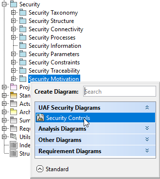 - In the modeling tool's main menu, click Create Diagram, search for Security Controls and select it.