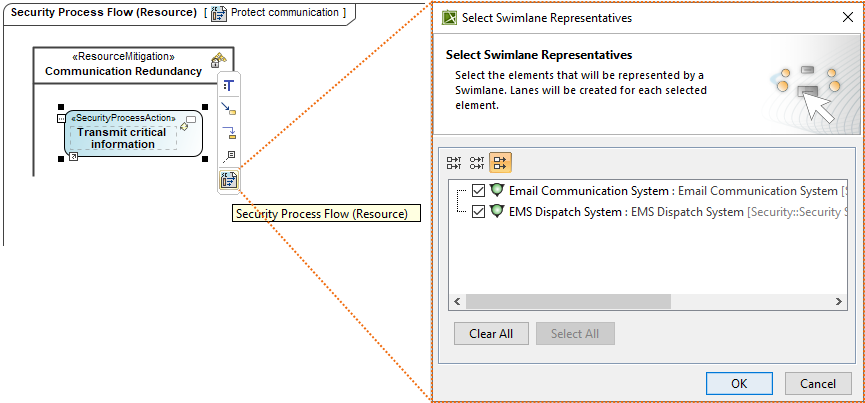 - The Select Swimlane Representatives dialog is displayed only when you have a resource structure defined.