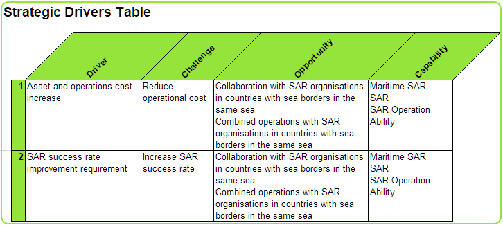The Strategic Drivers Table (St-Mv) allows you to assemble Drivers, Challenges, Opportunities, and Capabilities in a tabular form. Also, this table helps define relationships between Drivers and Challenges, Challenges and Opportunities, Opportunities and Capabilities. This table captures the Driver, Challenge, Opportunity, and Capability elements in strict order in each row: the Driver presenting Challenges, the Challenges motivating Opportunities, and the Opportunities impacting Capabilities.