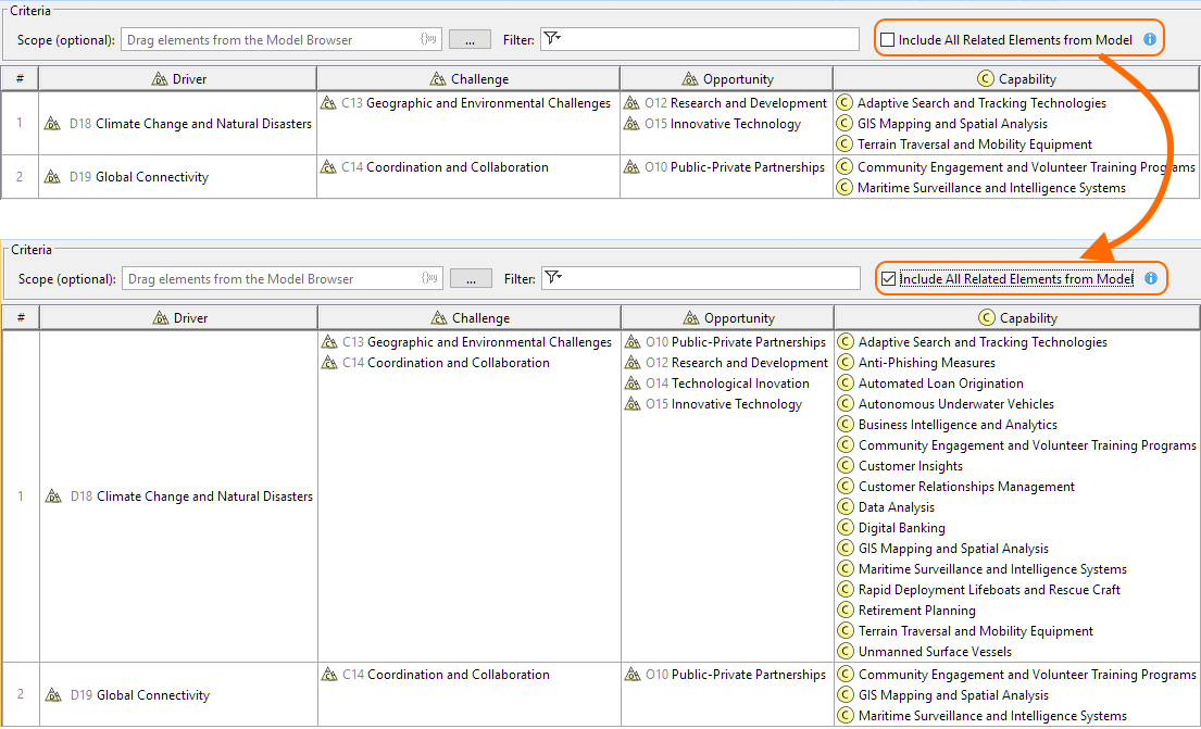 You can choose to include the element from the entire model as addition to those added or created from the Strategic Drivers Table. To accomplish this, in the table Criteria area, select the Include All Related Elements from Model check box.