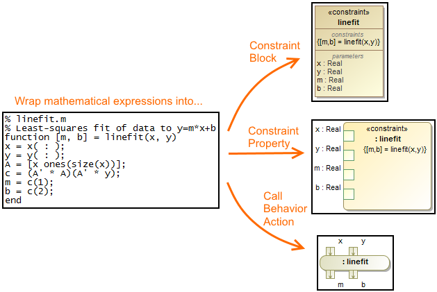 You can move the mathematical expressions from MATLAB source code into the model. Use the m-file to transfer functions to a Constraint Block, Constraint Property, or Call Behavior Action.