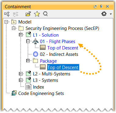 - Drag and drop the APR - APPROACH flight phase from the Flight Phases package present in the DO-326A Subject Library to the Flight Phases package present in the L1-Solution package.