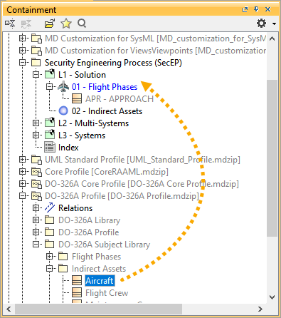 - Similarly, drag and drop the Aircraft indirect asset from the Indirect Assets package present in the DO-326A Subject Library to the Indirect Assets package present in the L1 - Solution package.