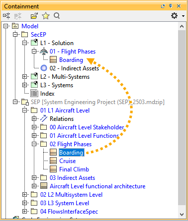 - Drag and drop the Boarding flight phase from the Flight Phases package present in the 01 L1 Aircraft Level to the Flight Phases package present in the L1-Solution package.