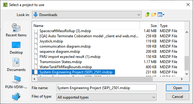 In the Select a project to use dialog, select the required System Engineering Project, and click Open.
