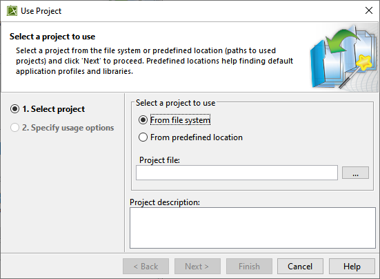 In the Use project dialog, select the Select project andFrom file system radio buttons, and click to open the Select a project to use dialog.
