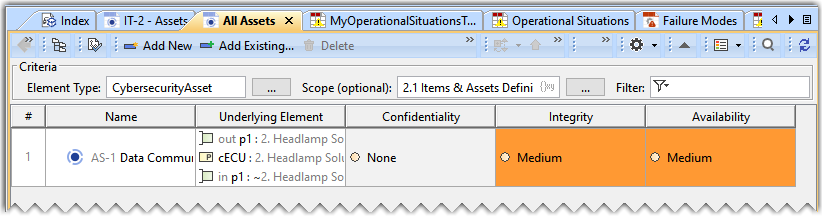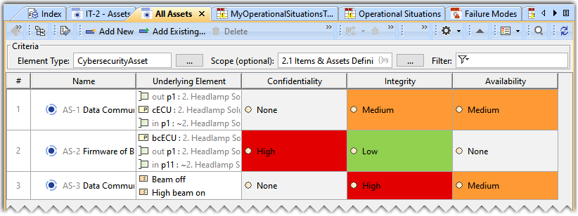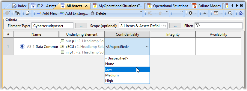 - Double-click each cell, namely Confidentiality, Integrity, and Availability in the Asset row. From the drop-down list, select the CIA properties.