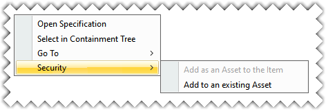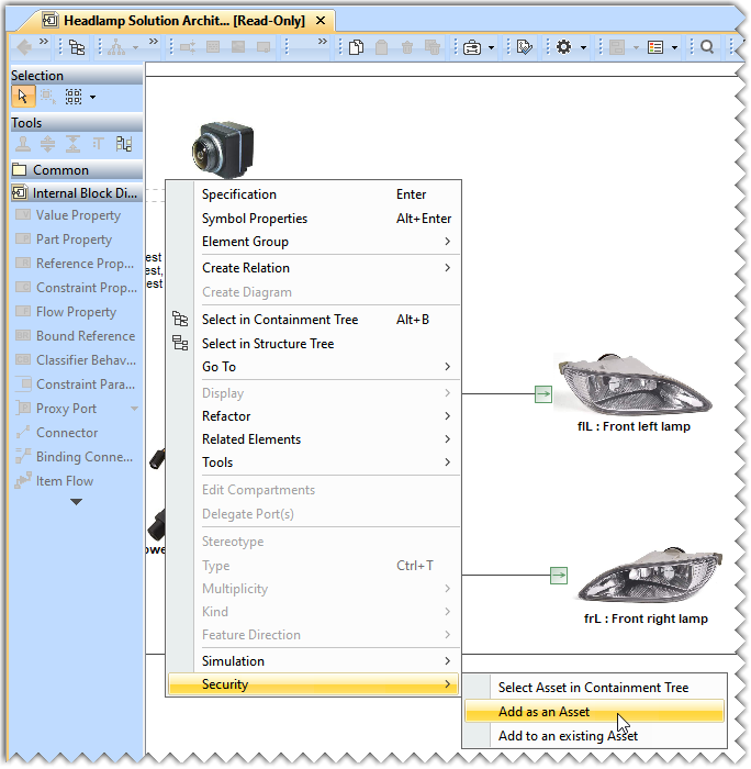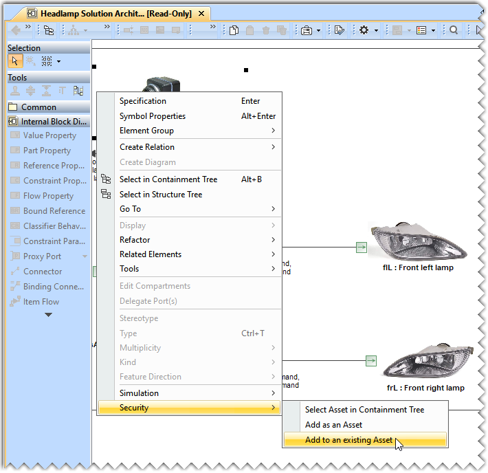 - In the system diagram, right-click an element(s) and select Security>Add to an existing Asset.
