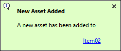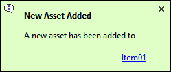 - The following notification message appears at the bottom right corner of the modeling tool once the asset is created. The message also provides a hyperlink to the item under which the asset is created.