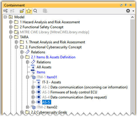Name the created Asset in the Containment tree and press Enter. The Asset has the prefix AS, which denotes that the created element is an Asset; the number 5 indicates that it is the fifth Asset created.