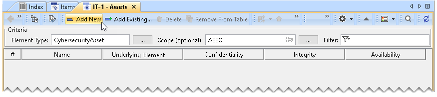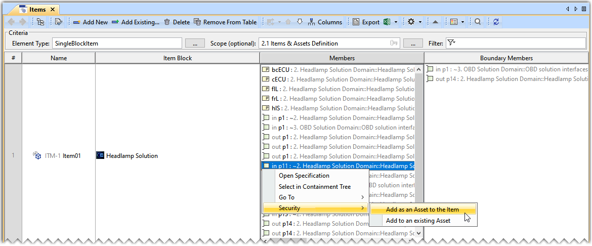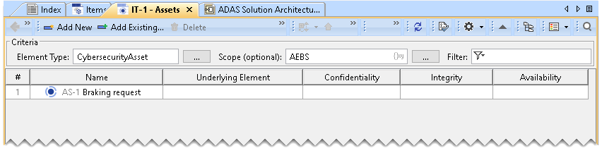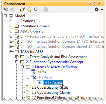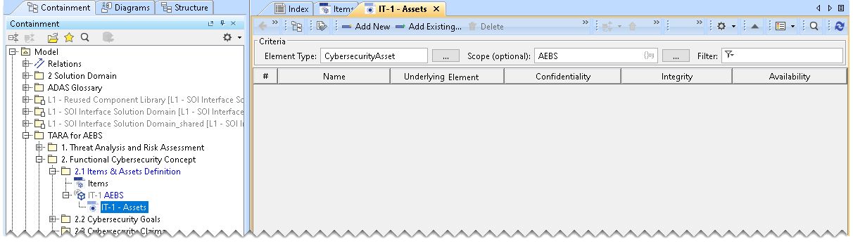 If you create a new project using the ISO 21434 Project template, then an Asset Table already exists in the 2.1 Items & Assets Definition package.