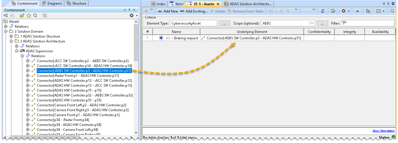 - You can also drag and drop SysML Elements (such as Connector, port, etc.) from the Containment tree to the Asset Table.