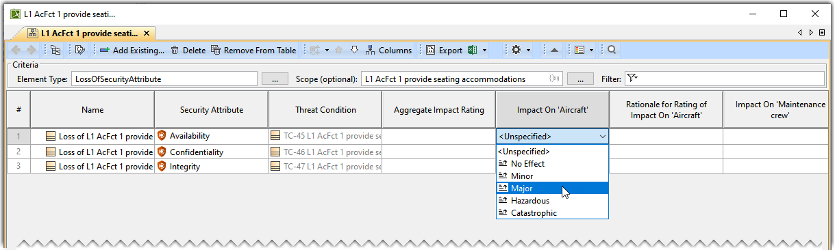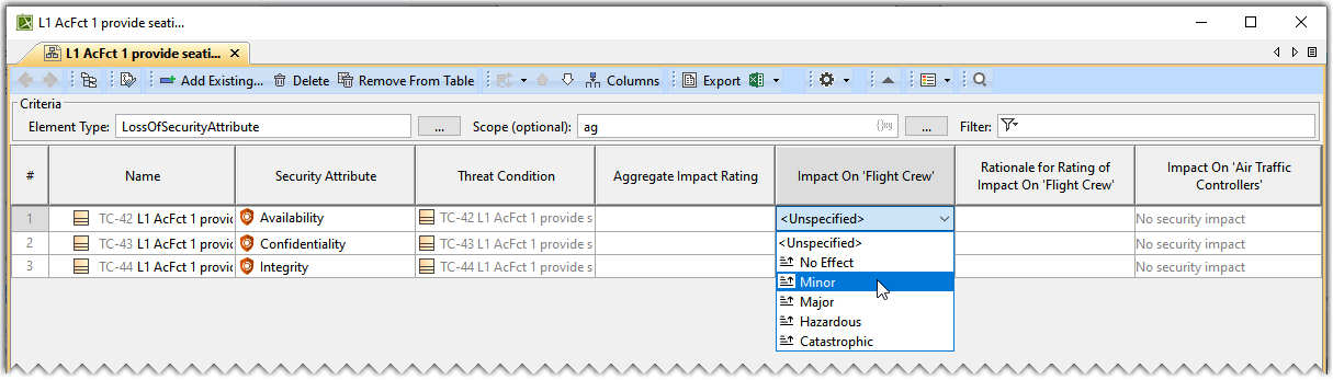 - Double-click the designated cell in any Loss of Security Attribute row and Impact on 'Flight Crew' column, and select the required Impact Rating from the drop-down list.
