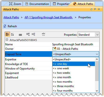 The Likelihood is calculated with the help of standard properties of the attack path, such as Elapsed Time, Specialist Expertise, Knowledge of Item/Component, Window of Opportunity, and Equipment. Each property has a different grading system, which has a numerical value assigned to it. These numerical values are based on the ISO/IEC 18045 standard.