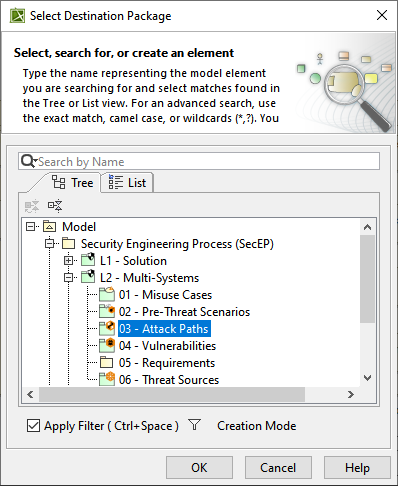 - In the Select Destination Package, select the 03 - Attack Paths package to save the newly created attack path.