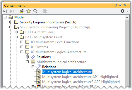 - In the Containment tree, open the Multisystem logical architecture IBD diagram present in the 02 L2 Multisystem Level package of the System Engineering Project(SEP).