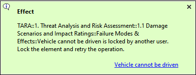 - When you update the SFOP ratings of the damage scenario and the Effect element is locked by another user, the following notification is displayed with the locked Effect element link at the bottom right corner of the modeling tool.