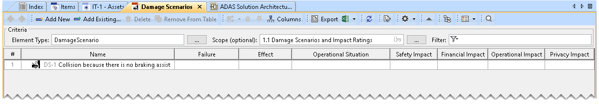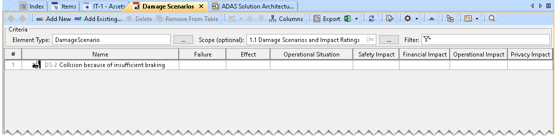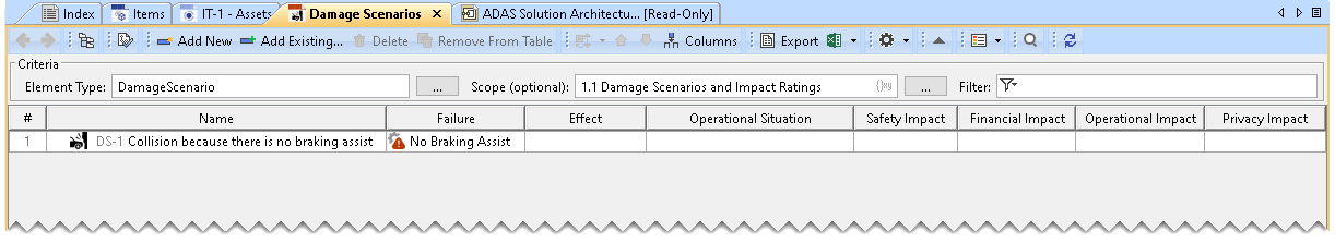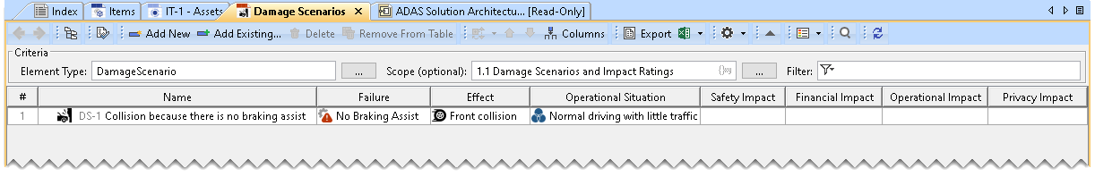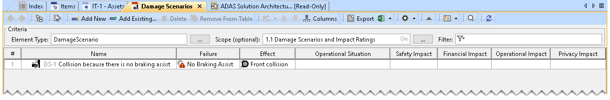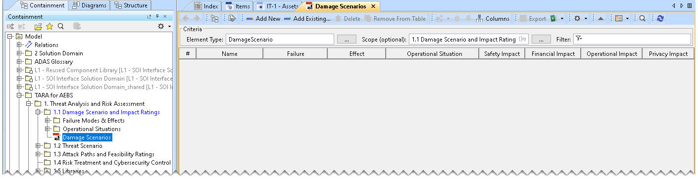 If you create a new project using the ISO 21434 Project template, then an Damage Scenarios Table already exists in the 1.1 Damage Scenarios and Impact Ratings package.
