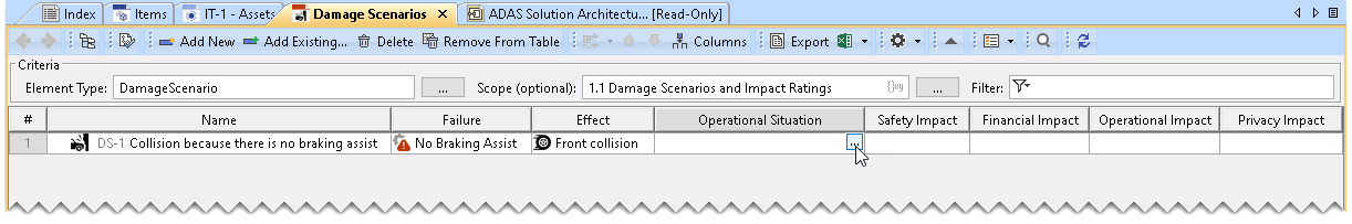 - Double-click the designated cell in the Operational Situation column and the required Damage Scenario's row and click