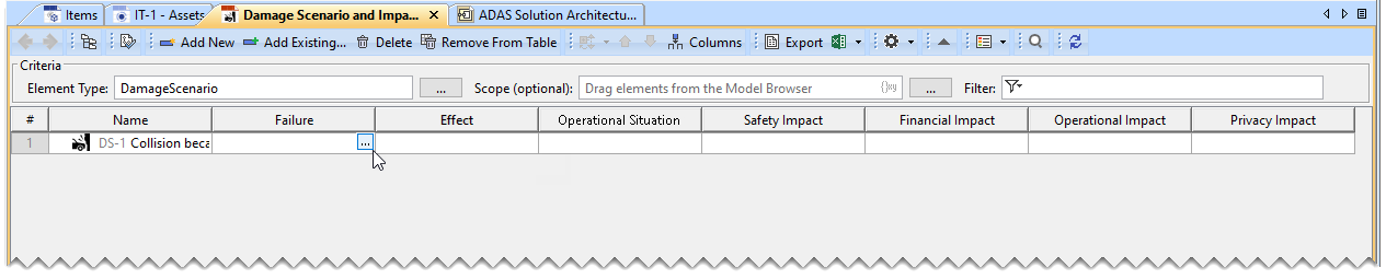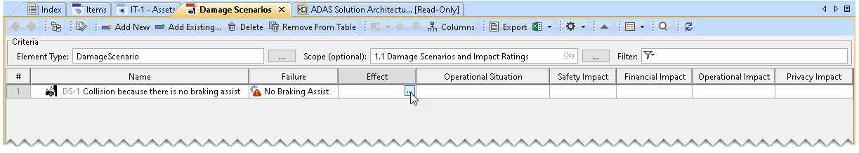 - Double-click the designated cell in the Effect column and the required Damage Scenario's row and click