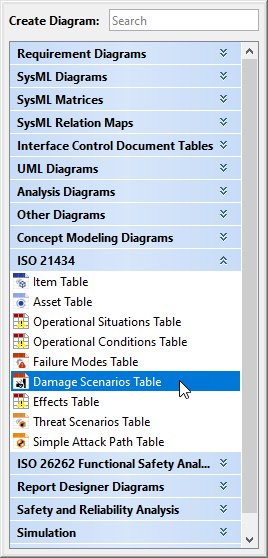 - In the dialog, expand ISO 21434 and select Damage Scenario Table.