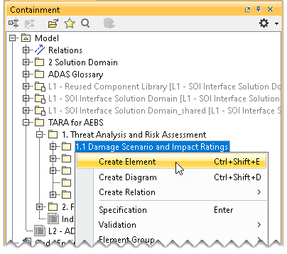 - In the Containment tree, right-click Damage Scenario and Impact Ratings and select Create Element.