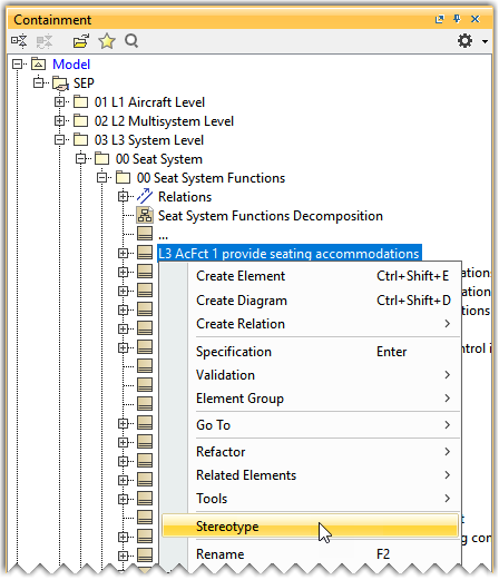 In the Containment tree, right-click an L3-level security function and click Stereotype.