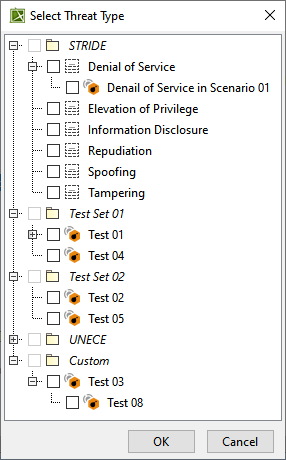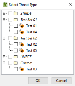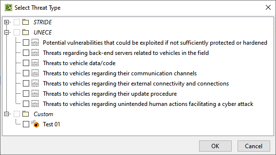 - From the Select Threat Type dialog, select a threat type(s) from either the STRIDE or UNECE package. You can also select a custom-created threat type.