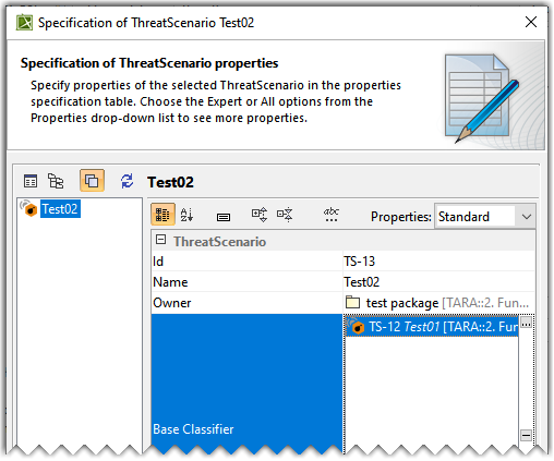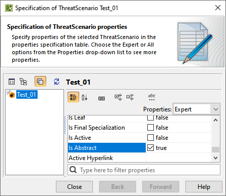 - Open the Specification dialog of the newly created threat scenario in the Expert mode.