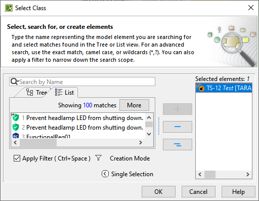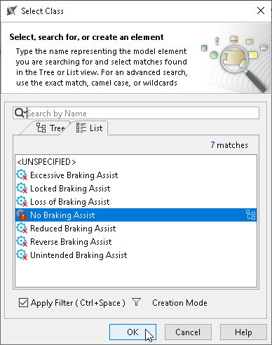 - From the Select Class dialog, select Failure.