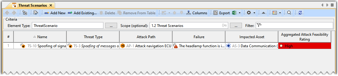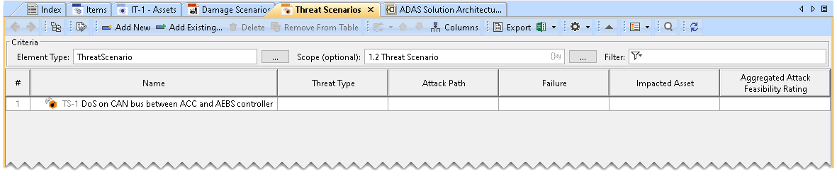 If you create a new project using the ISO 21434 Project template, then a Threat Scenario Table already exists in the 1.2 Threat Scenarios package.