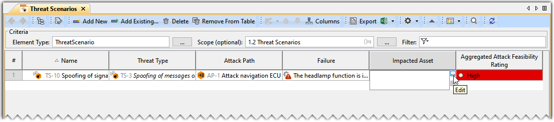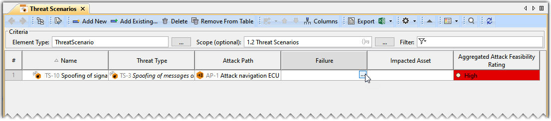 - Double-click the designated cell in the Failure column and the required Threat Scenario's row and click