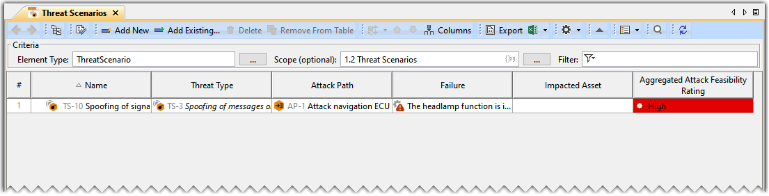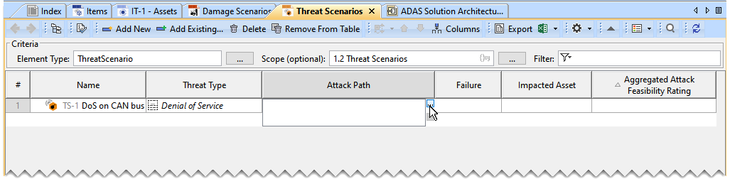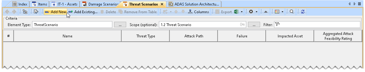 - In the Threat Scenario Table, click Add New. A row is added in the Threat Scenario Table, which shows the new Threat Scenario.
