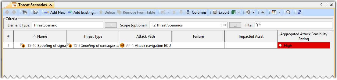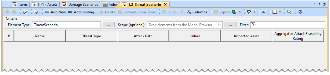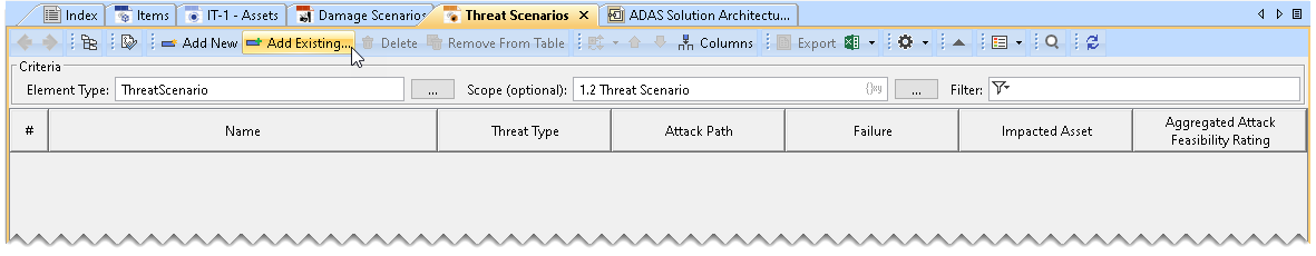 - In the Threat Scenario Table, click Add Existing.