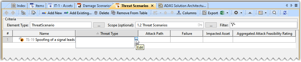 - Double-click the designated cell in the Threat Type column and the required Threat Scenario's row and click