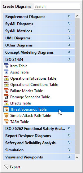 - In the dialog, expand ISO 21434 and select Threat Scenario Table.