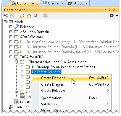 - In the Containment tree, right-click Threat Scenario and select Create Element.