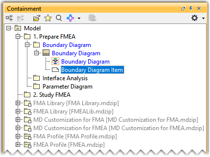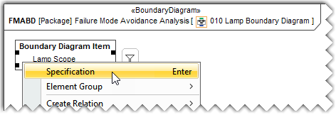 - In the Containment tree, select the newly created Boundary Diagram Item and rename it with the help of the Specification dialog.