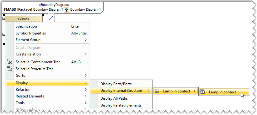 - Right-click the block and select Display>Display Internal Structure>Lamp in context>Lamp in context.