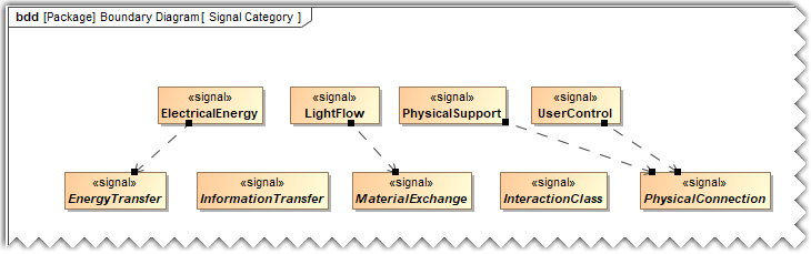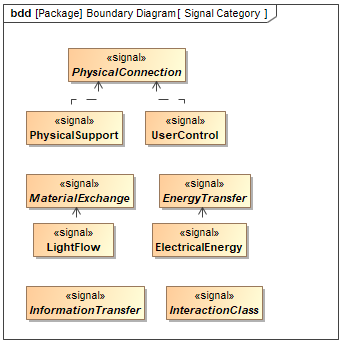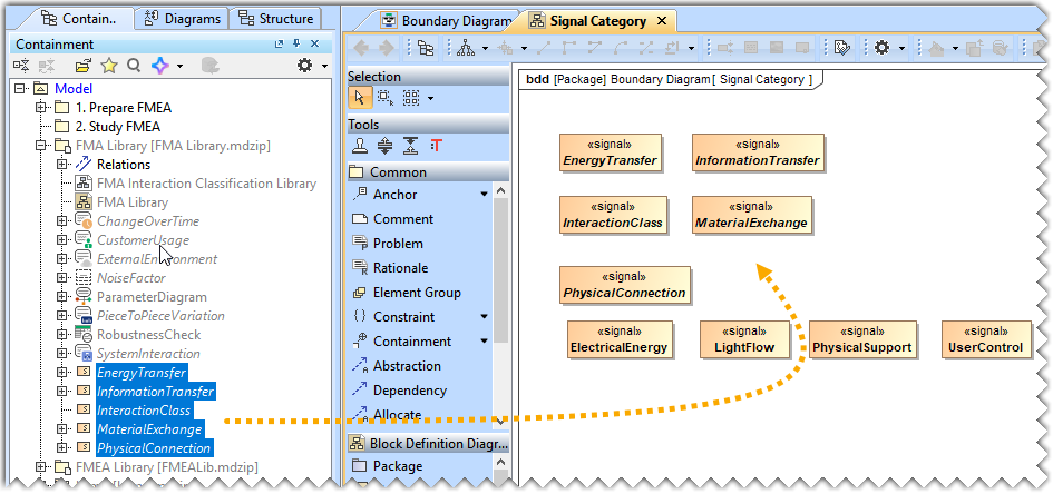 - Drag and drop the EnergyTransfer, InformationTransfer, InteractionClass, MaterialExchange, and PhysicalConnection elements from the FMA Library package in the diagram pane.