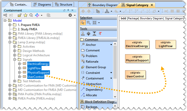 - Drag and drop the signals from the Lamp>Signals package in the diagram pane.