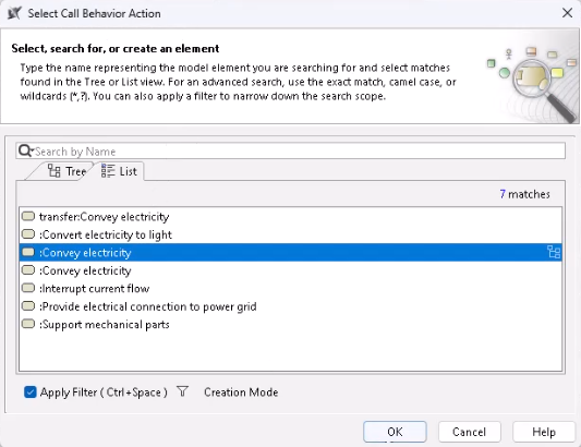 the icon, found near the Call Behavior Action Element. - In the Select Call Behavior Action dialog, select the Call Behavior Action and click OK.