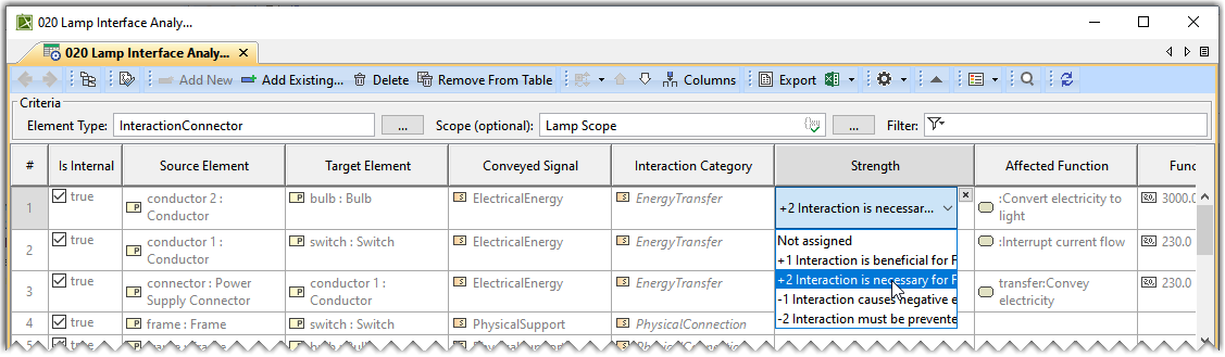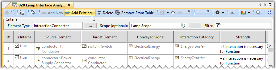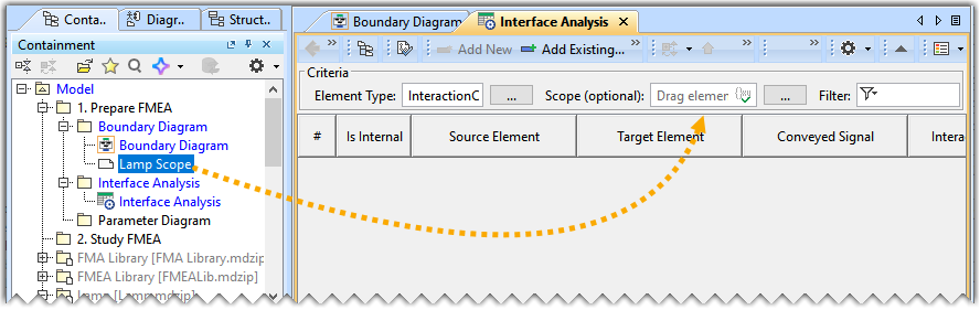 - From the Containment tree, drag and drop the Lamp Scope element on the Scope of the Interface Analysis table.