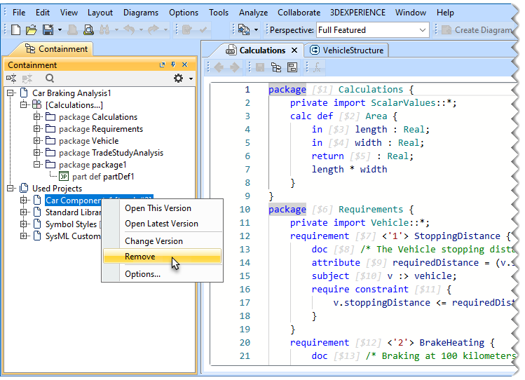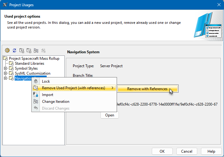 • Right-click a used project and select Remove Used Project (with references) > Remove with References.